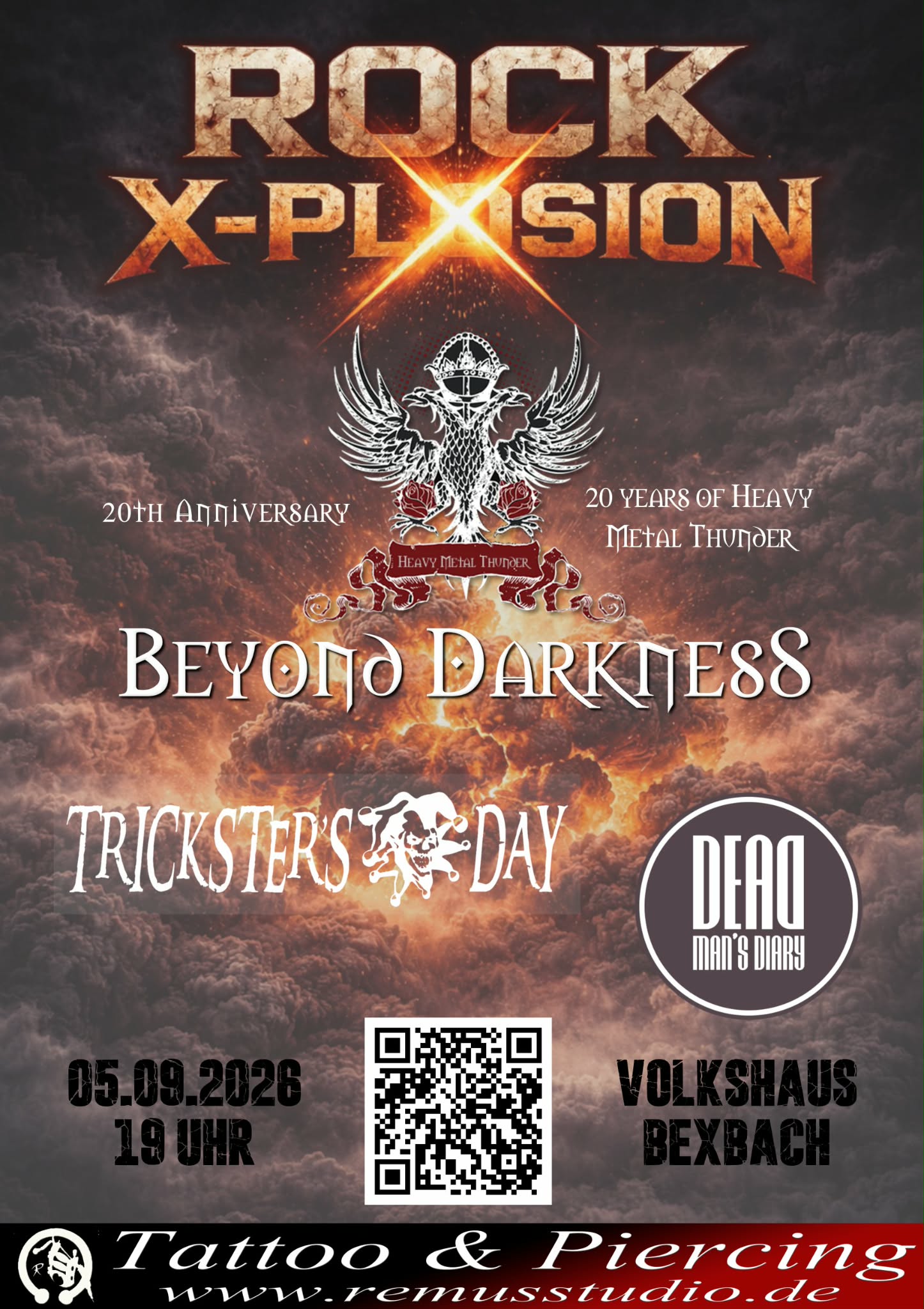 Am 05.09.2026 spielen wir bei der Rock X-Plosion im Volkshaus Bexbach gemeinsam mit Trickster’s Day und Beyond Darkness, die ihr 20-jähriges Bandjubiläum feiern.